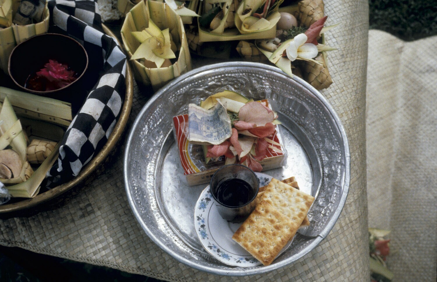 Offer bestaande uit een glas met drank en crackers, en geld.