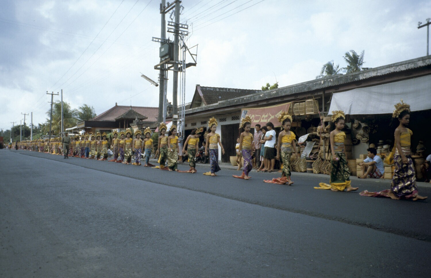 Een lange rij meisjes met speciaal (dans?) kostuum aan.