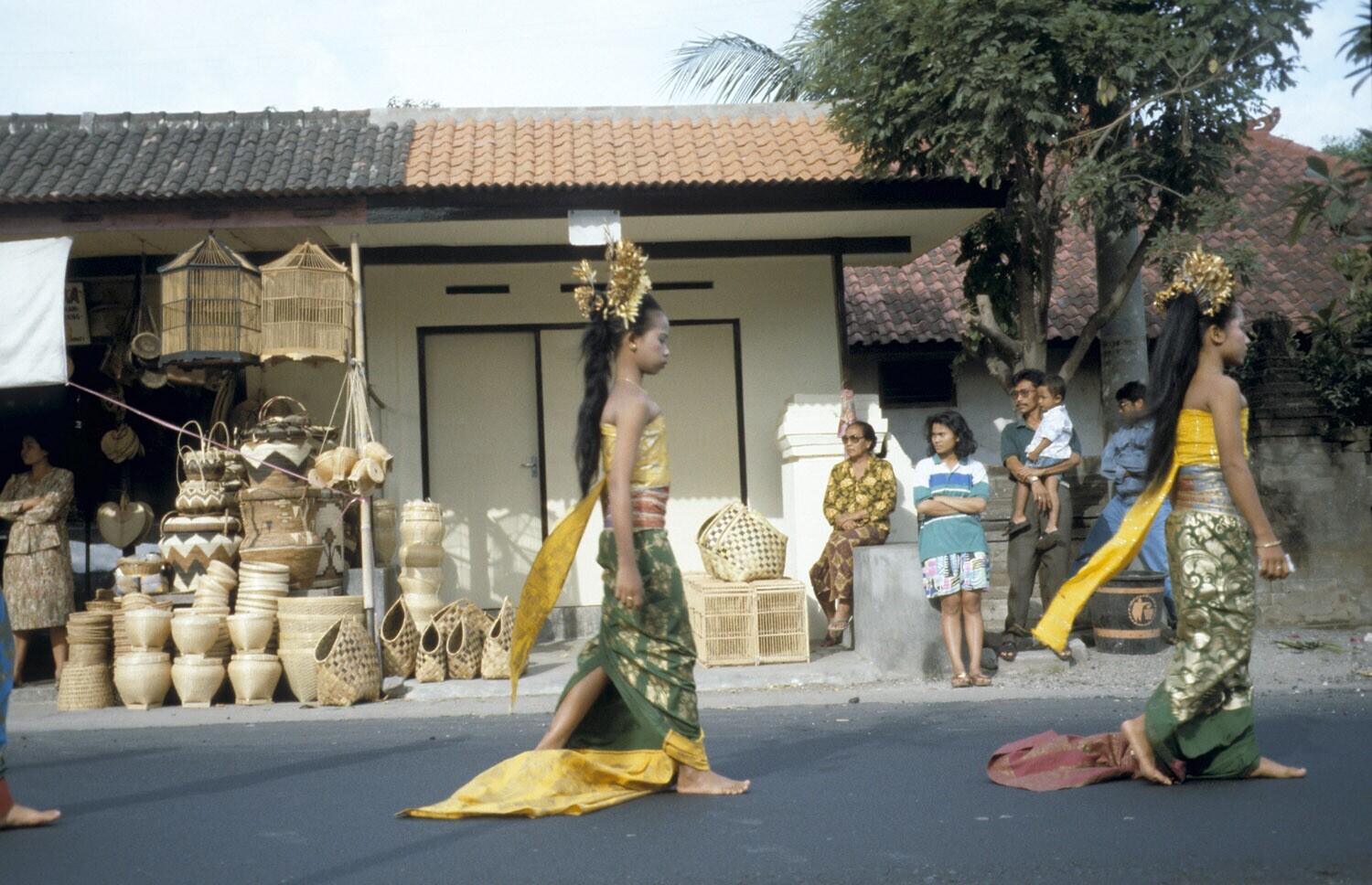 Een lange rij meisjes met speciaal (dans?) kostuum aan.