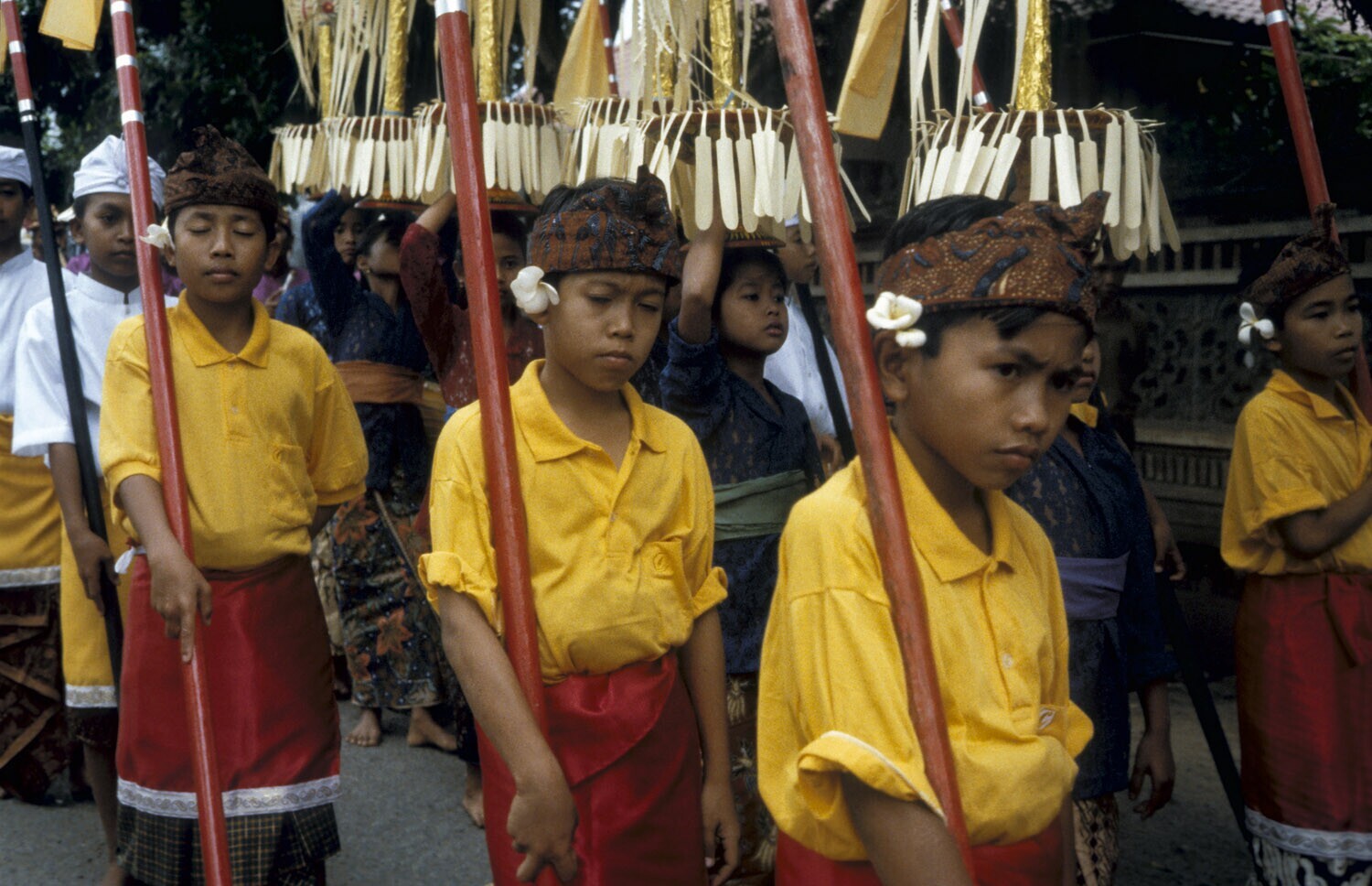Jongens met lange stokken, daartussen een rij meisjes met offers.