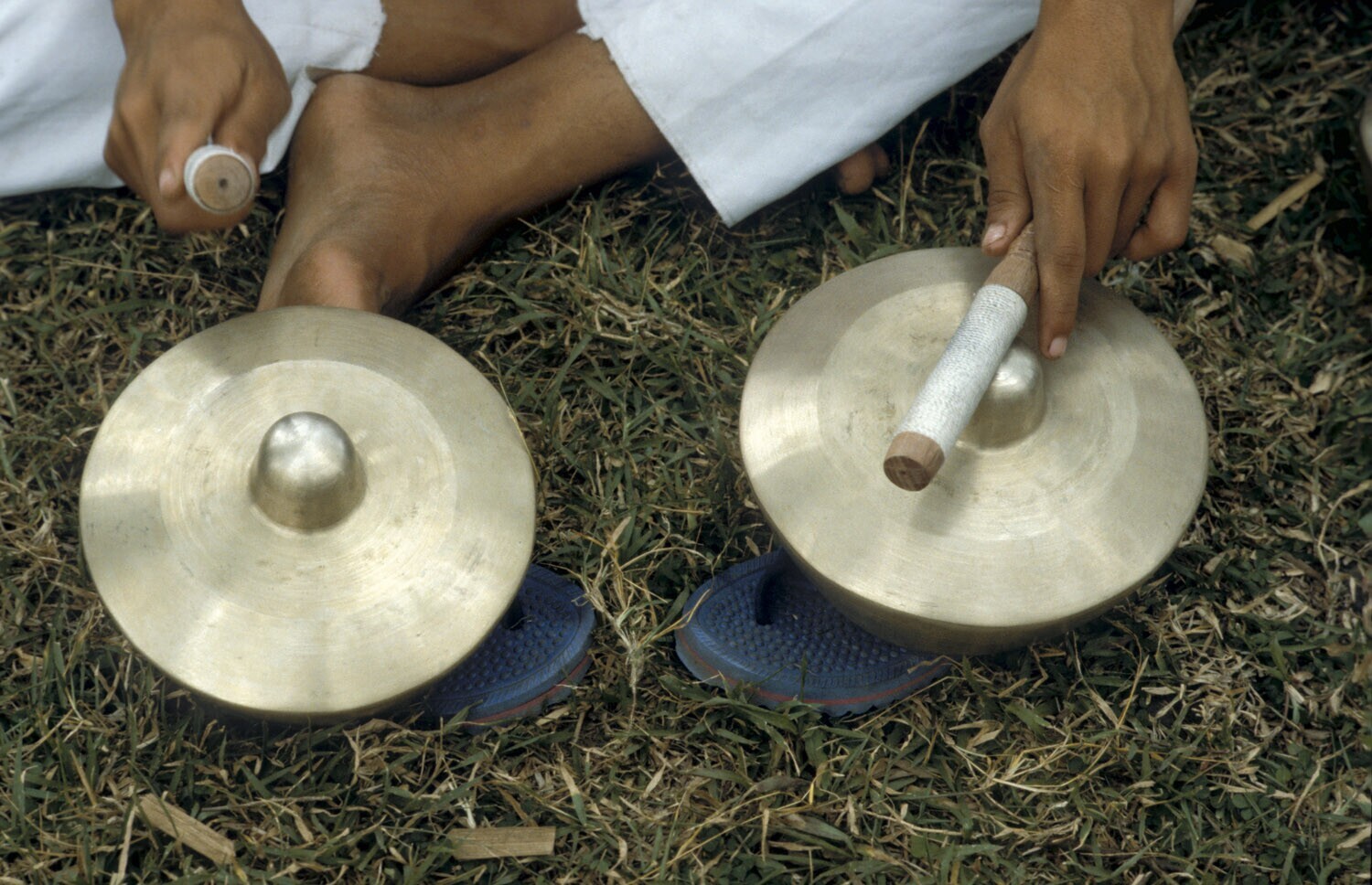 Close-up van het bespelen van een deel van het gamelan-orkest.