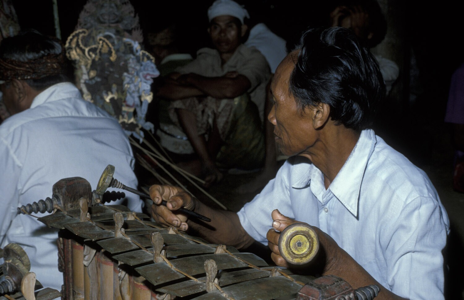 Musician accompanying a wayang performance by a puppeteer during or after the cremation ceremony of Cokorda Gede Agung Sukawati