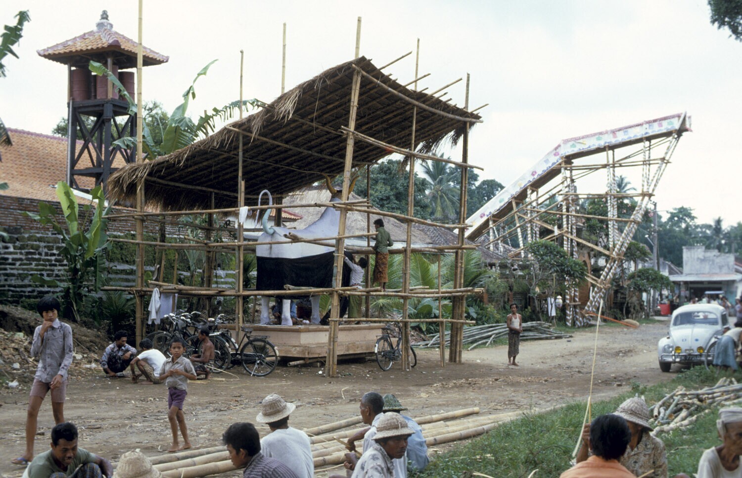The stairs leading to the cremation tower and the bull-like coffin under construction at the puri, to be used during the cremation ceremony of Cokorda Gede Agung Sukawati