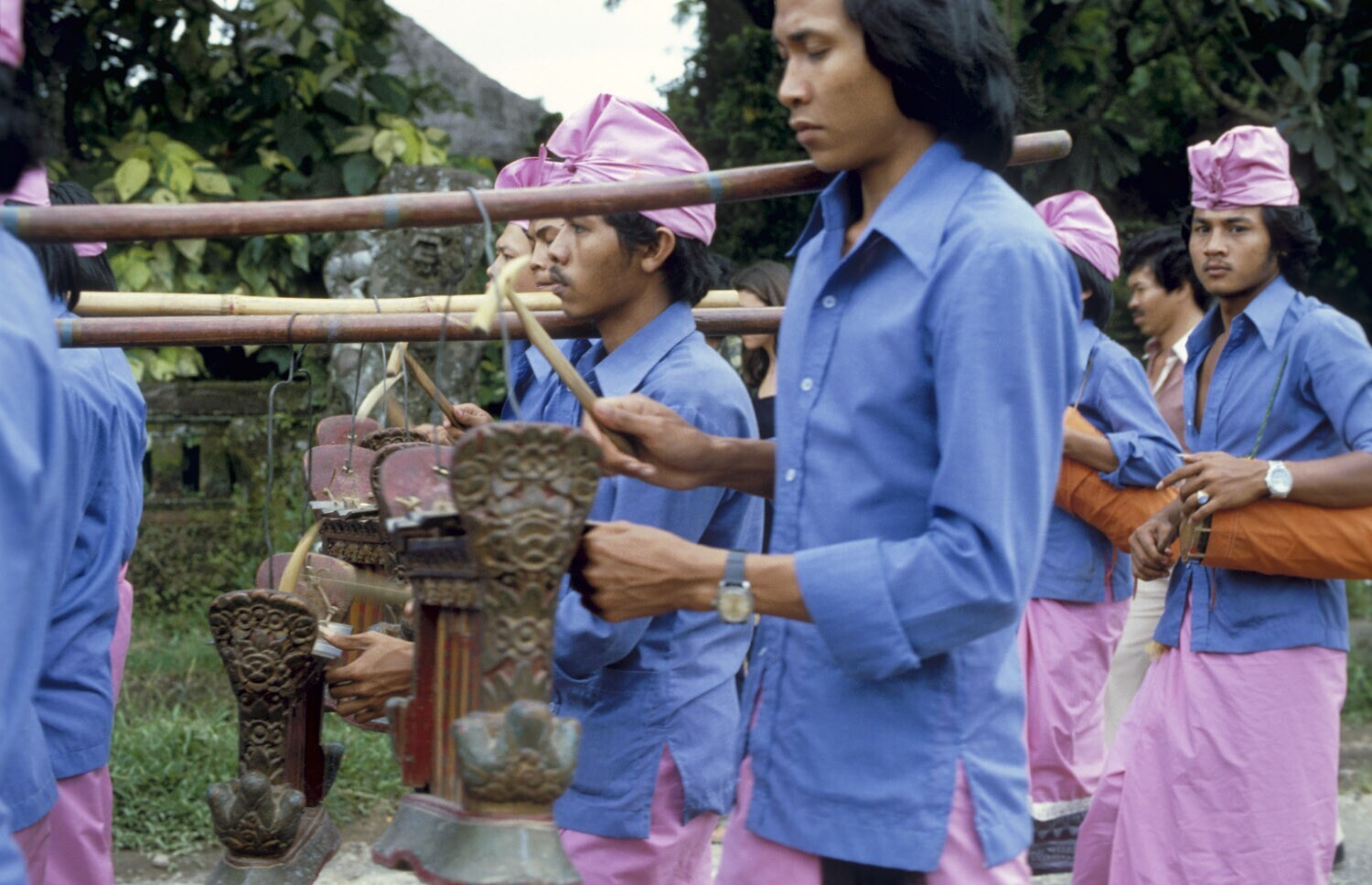 Musicians in the procession which brings water from a holy well to be used during the cremation ceremony of Cokorda Gede Agung Sukawati