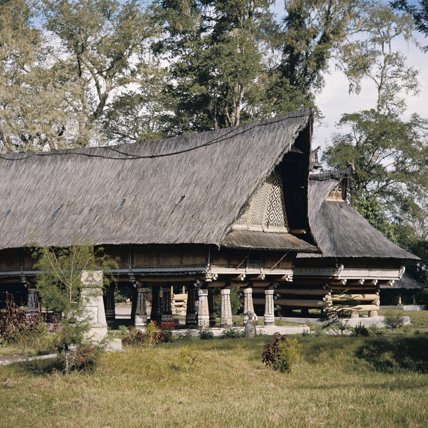 Sumatra, district Purga, Simalungun. Versierde gevel van het Radjahuis Rumah Bolon