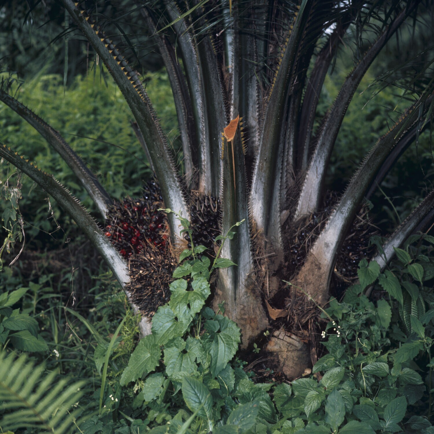 Close-up van een oliepalm met vruchtentros, onderneming Marihat