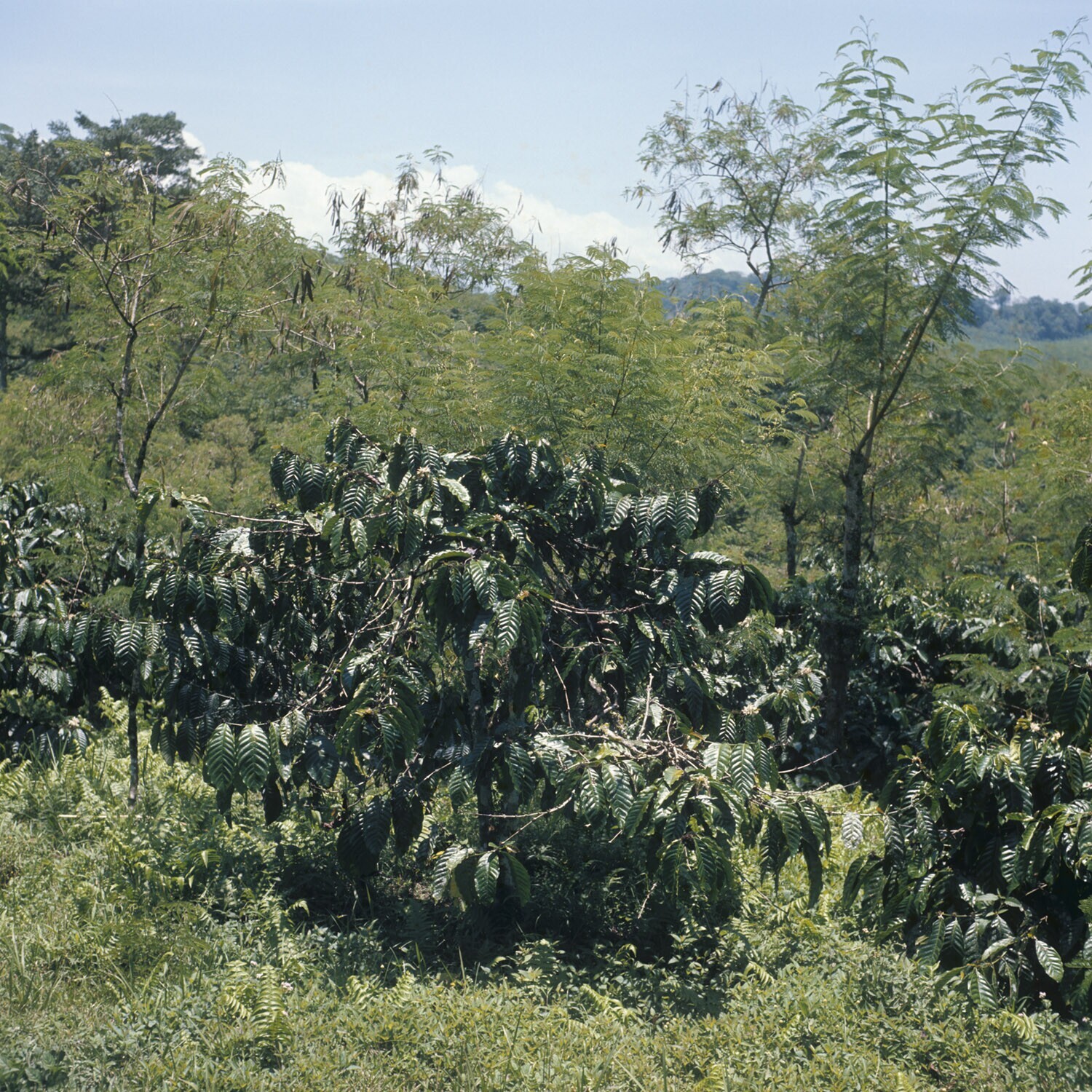De jonge koffieplanten uitgezet in de volle grond, met isolatiegeulen tegen wortelziekten. Koffie en caçao-onderneming 'Malangsari' bij Kalibaru