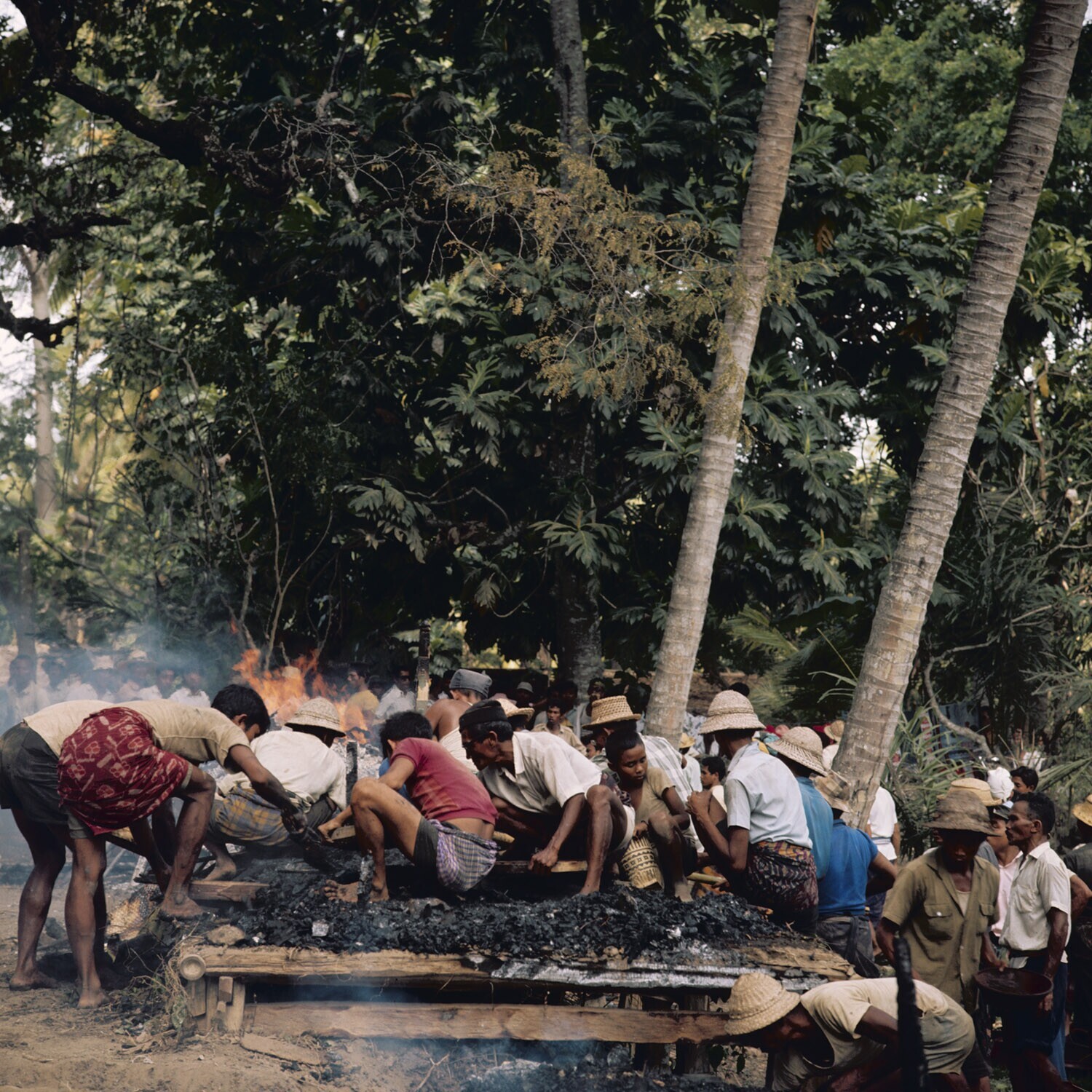 Familieleden verzamelen de as van de gecremeerde overledenen