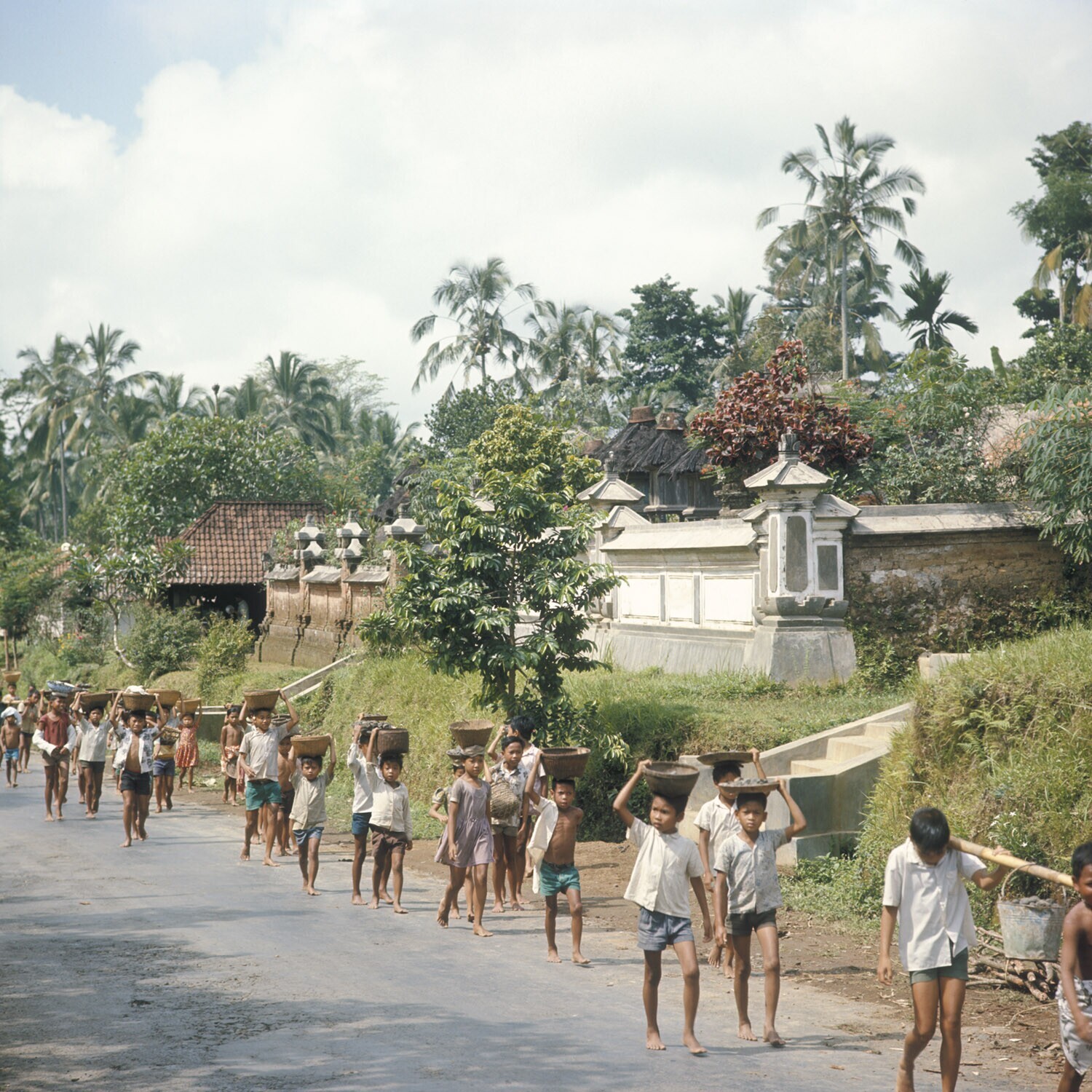 Kinderen dragen mandjes op hun hoofd