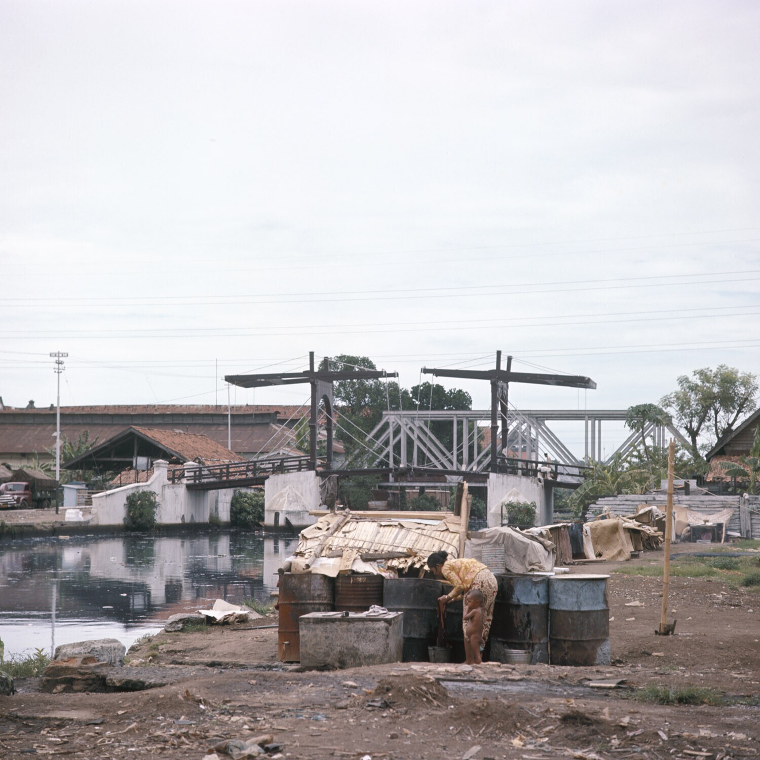 Huts of people who moved to the city to try their luck, in front of the old Dutch bridge across the Kali Besar