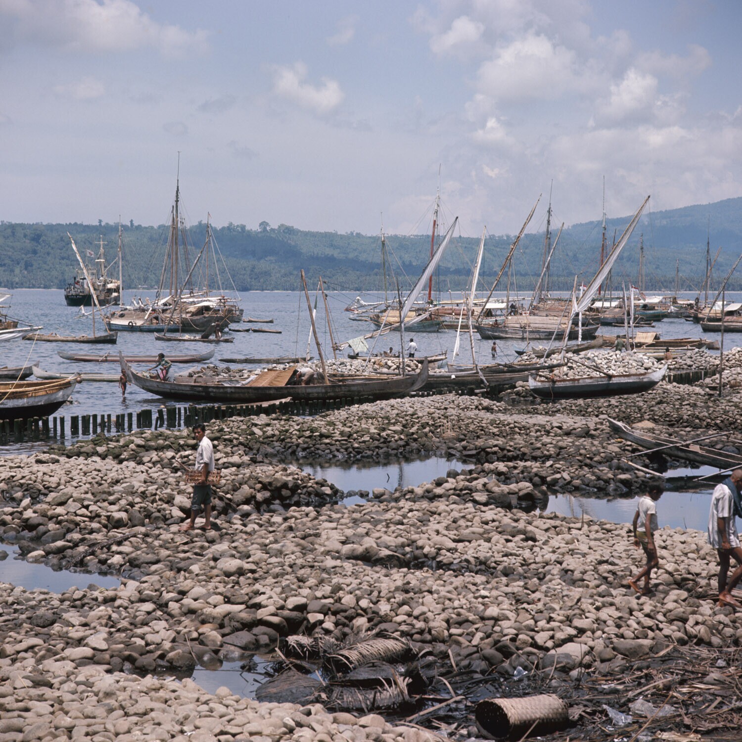 Aanleg van strekdammetjes in de haven van Ambon. Op de achtergrond vissersschepen voor de vangst op tonijn