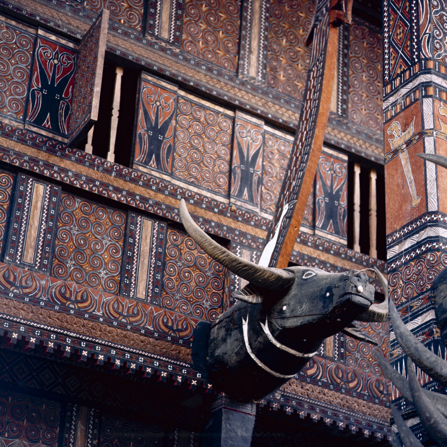 Voorgevels van huizen in dorp Pilawa, Tana Toradja, Sulawesi
