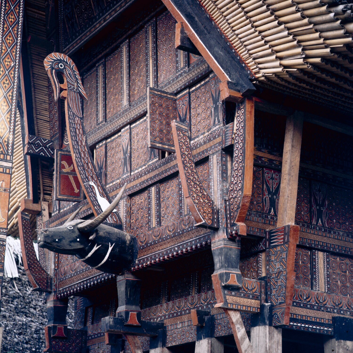 Voorgevels van huizen in dorp Pilawa, Tana Toradja, Sulawesi