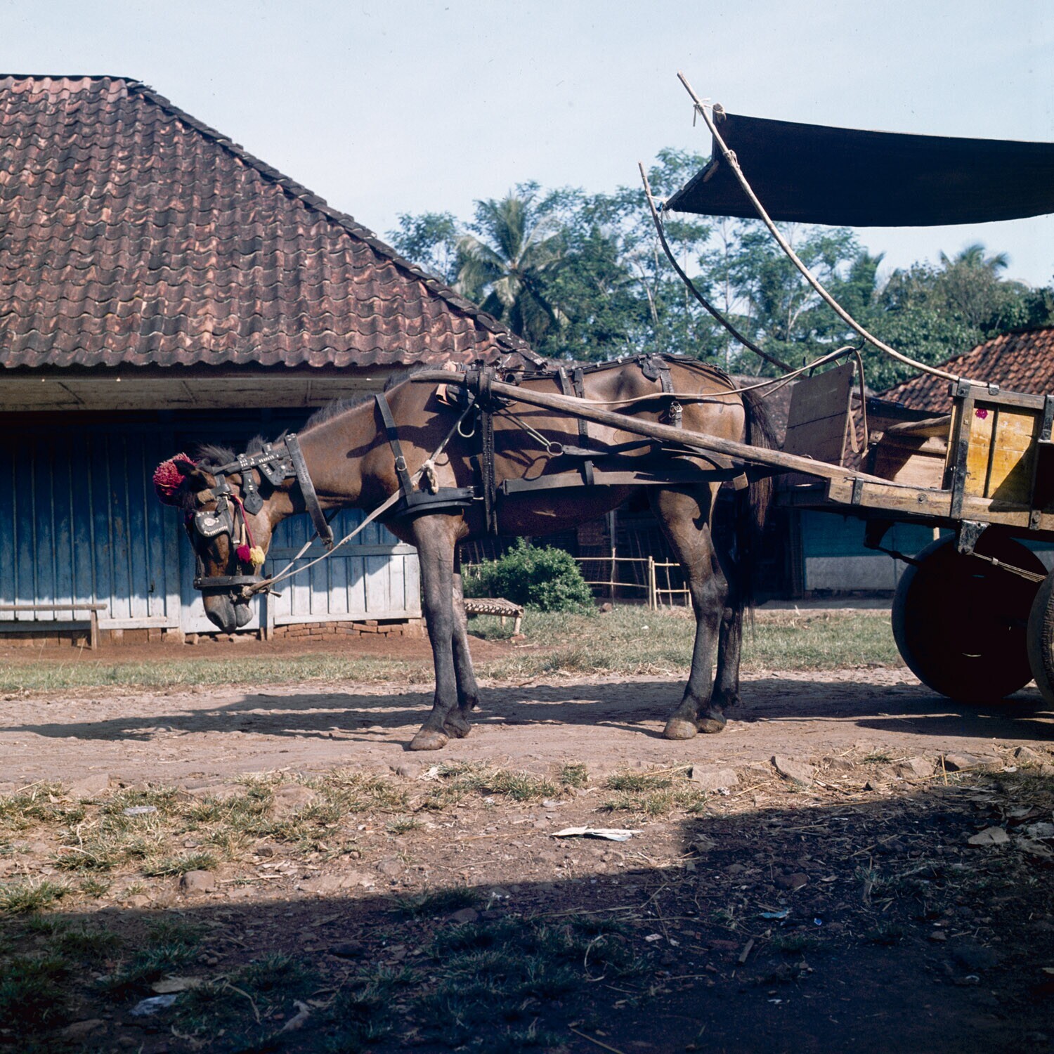 Paard-en-wagenkarretjes onderhouden het openbare vervoer tussen de dorpen, Jatiluhur, West-Java.