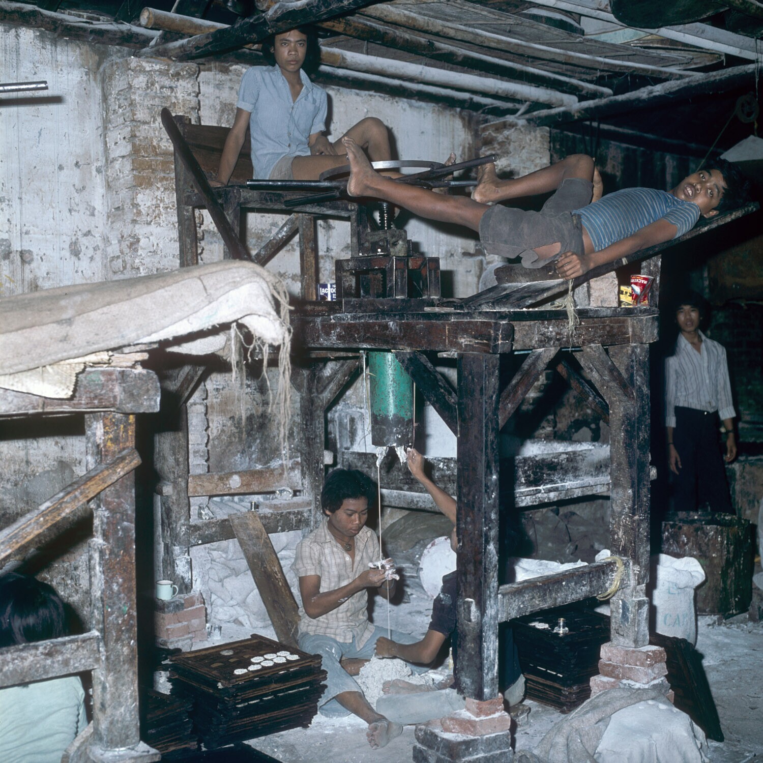 Kroepoekfabriek (Palembang-kroepoek) , Bandung. Onder elke pers zitten twee jongens die de geperste deegsliert opvangen in een klein bakje om de typische vorm te geven van kroepoek Palembang.
