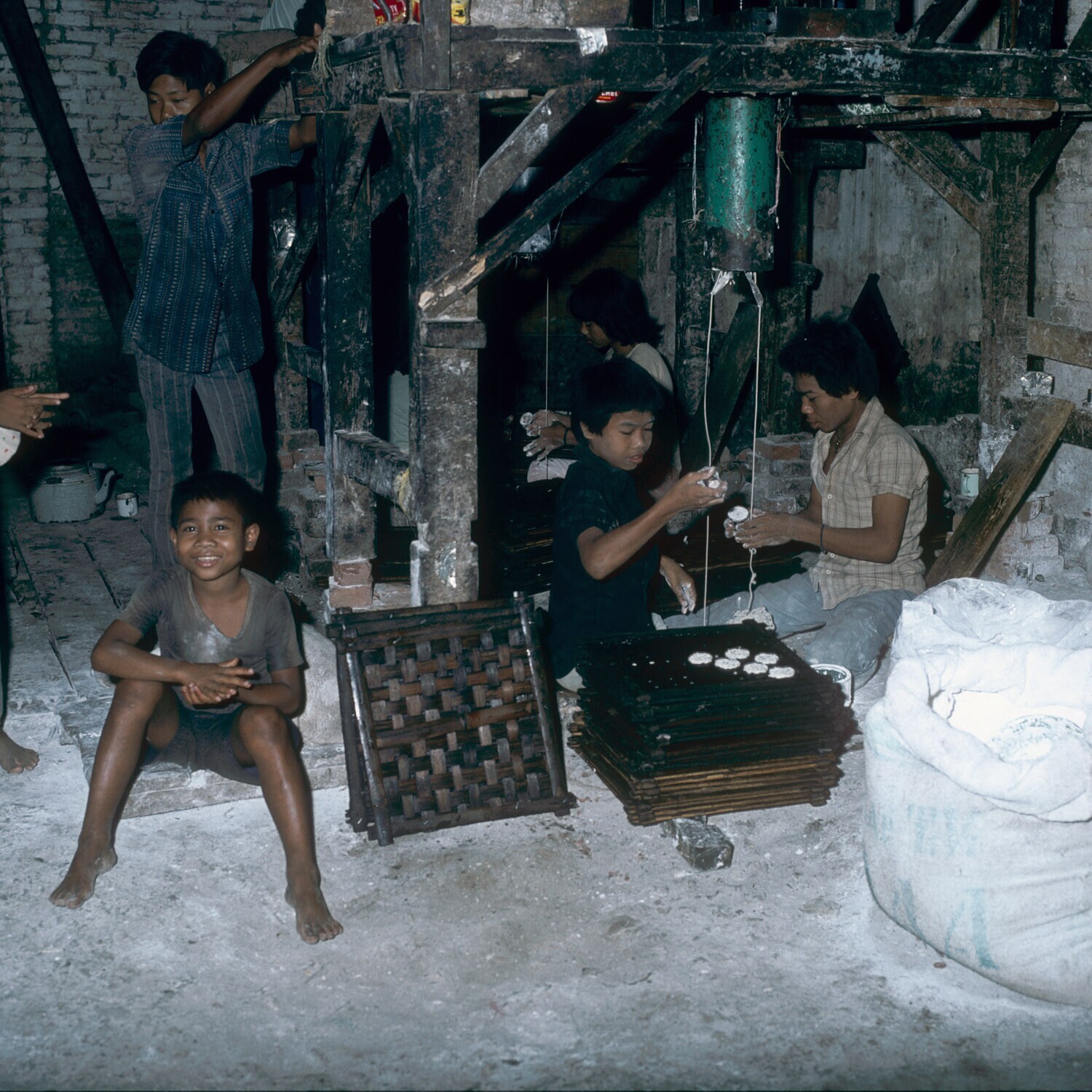 Kroepoekfabriek (Palembang-kroepoek) , Bandung. Onder elke pers zitten twee jongens die de geperste deegsliert opvangen in een klein bakje om de typische vorm te geven van kroepoek Palembang.