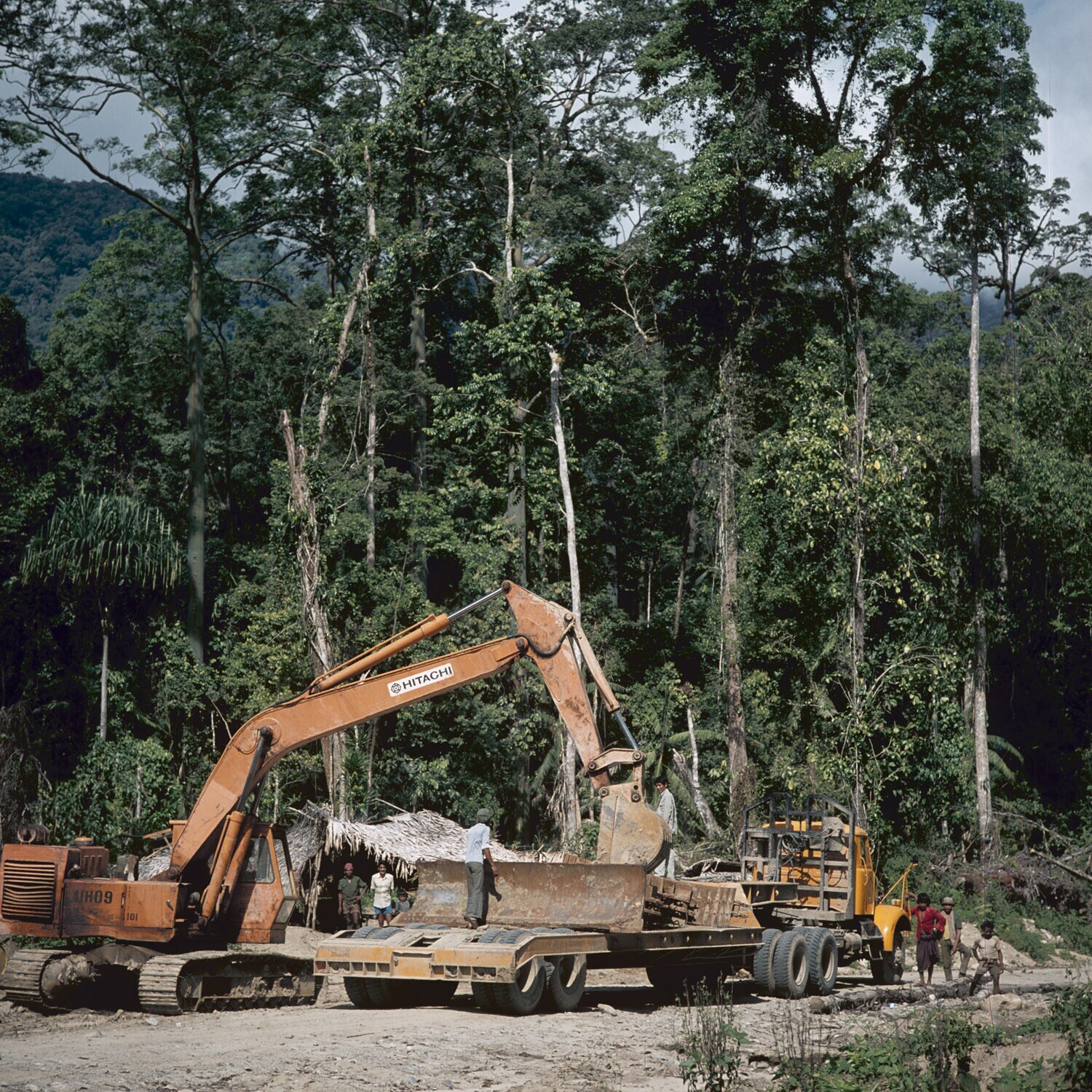 Graafmachines en mensen op wagens bij een wegaanleg door het regenwoud ten zuiden van Palu, Sulawesi