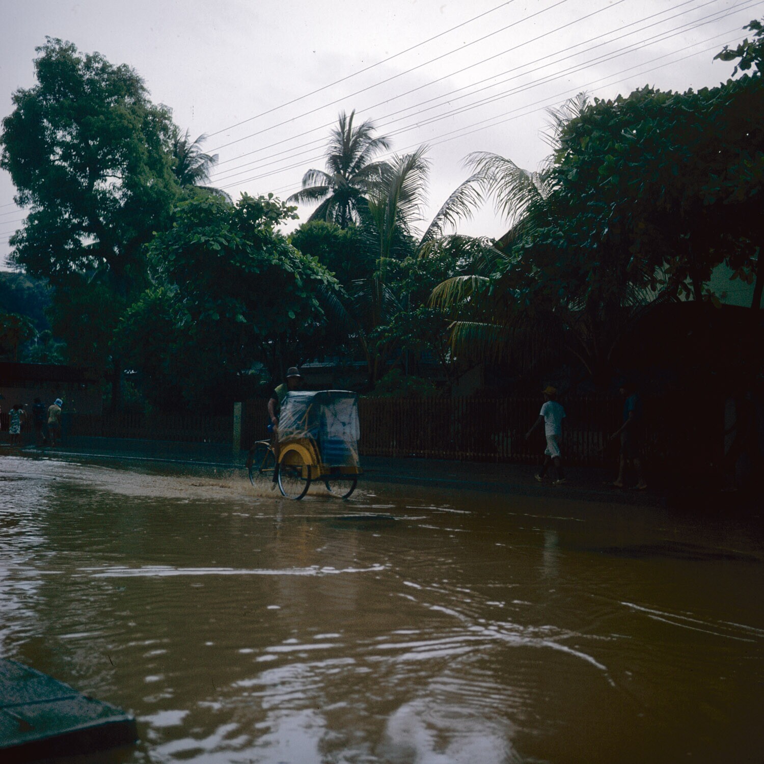 Een flinke regenbui veroorzaakt een overstroming, doordat het water niet meer wordt afgevoerd door de dichtgeslibde rivier, Ambon.