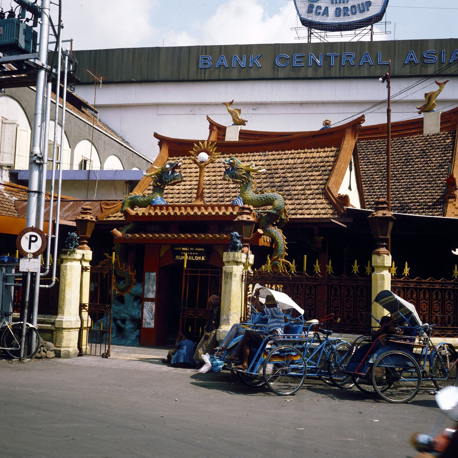Een Chines tempeltje temiddien van moderne hoogbouw, o.a. de Bank Central Asia, Surabaya.