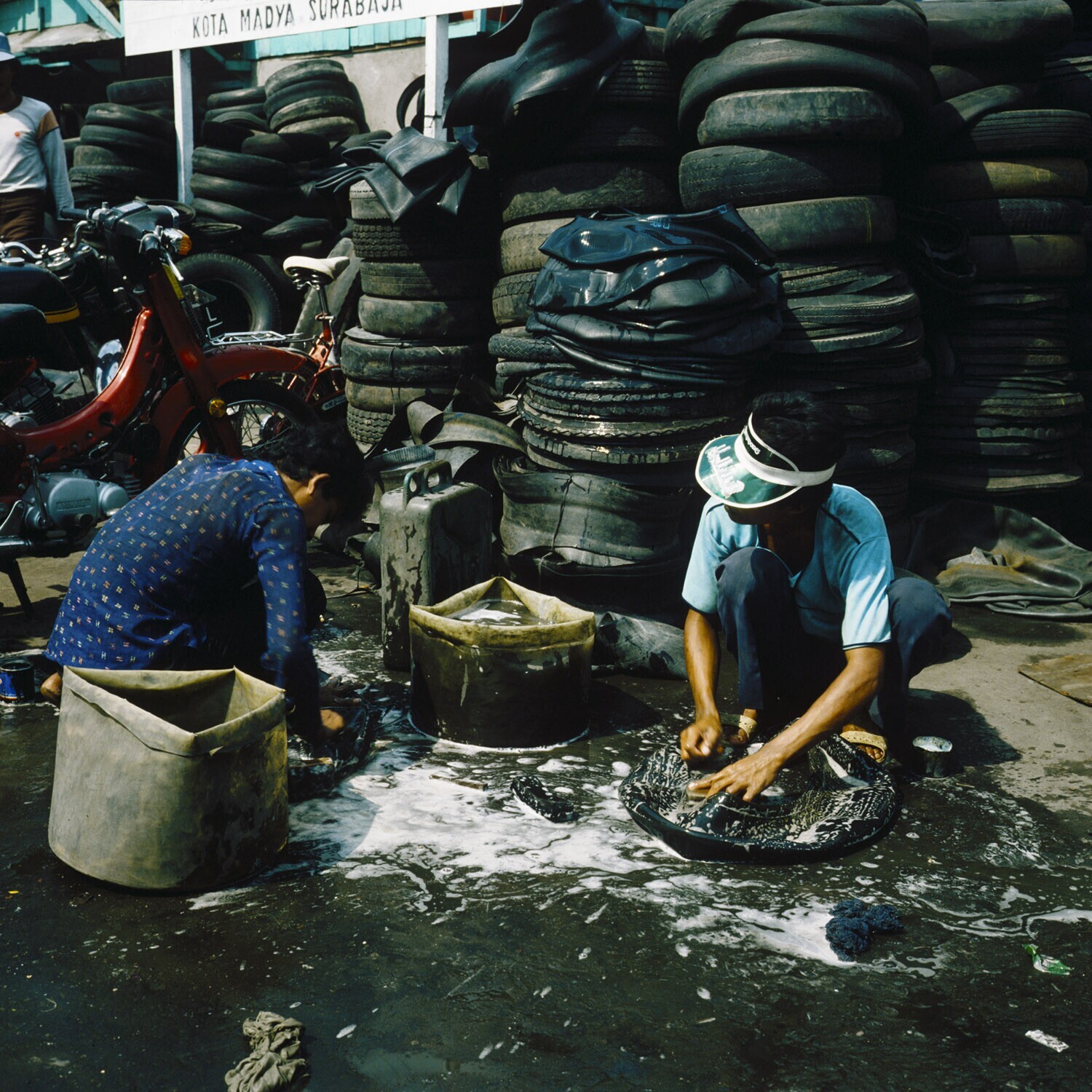 Gebruikte autobanden op de pasar Bibis (de markt in de wijk Bibis), Soerabaya.