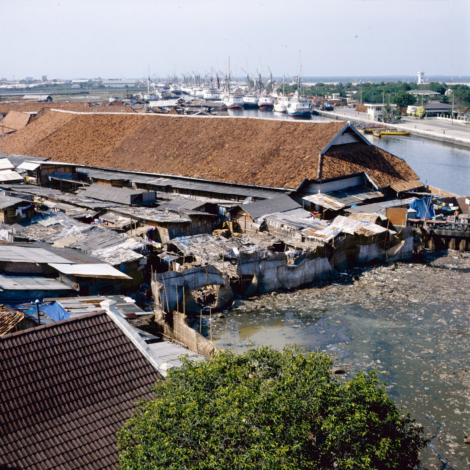Gezicht vanaf de Uitkijk over de Pasar Ikan en de haven Sunda Kelapa