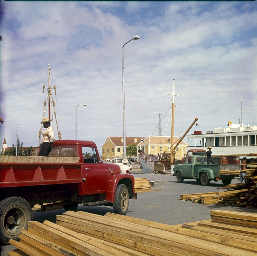 Afladen van hout bij de haven van Kralendijk, met aan de overkant vermoedelijk het postkantoor