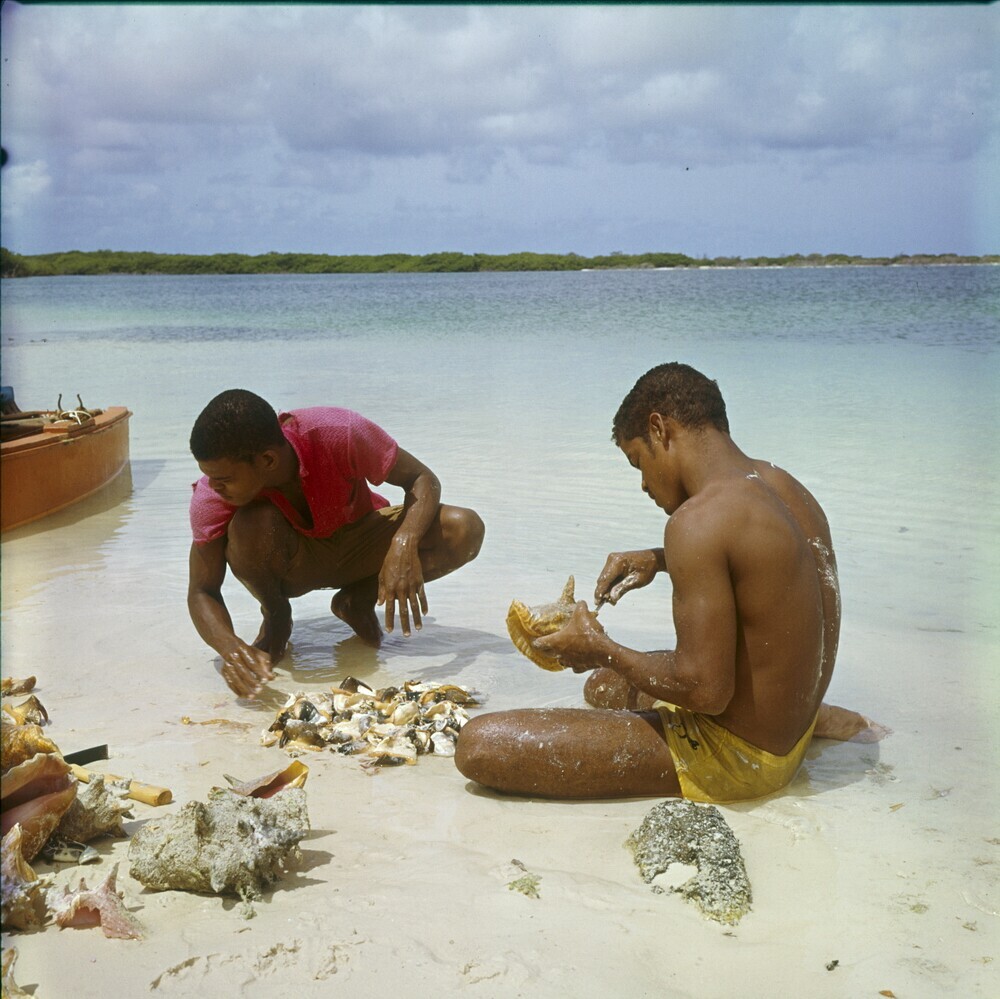 Karkóvissers halen de weekdieren uit de schelp bij de lagune Lac