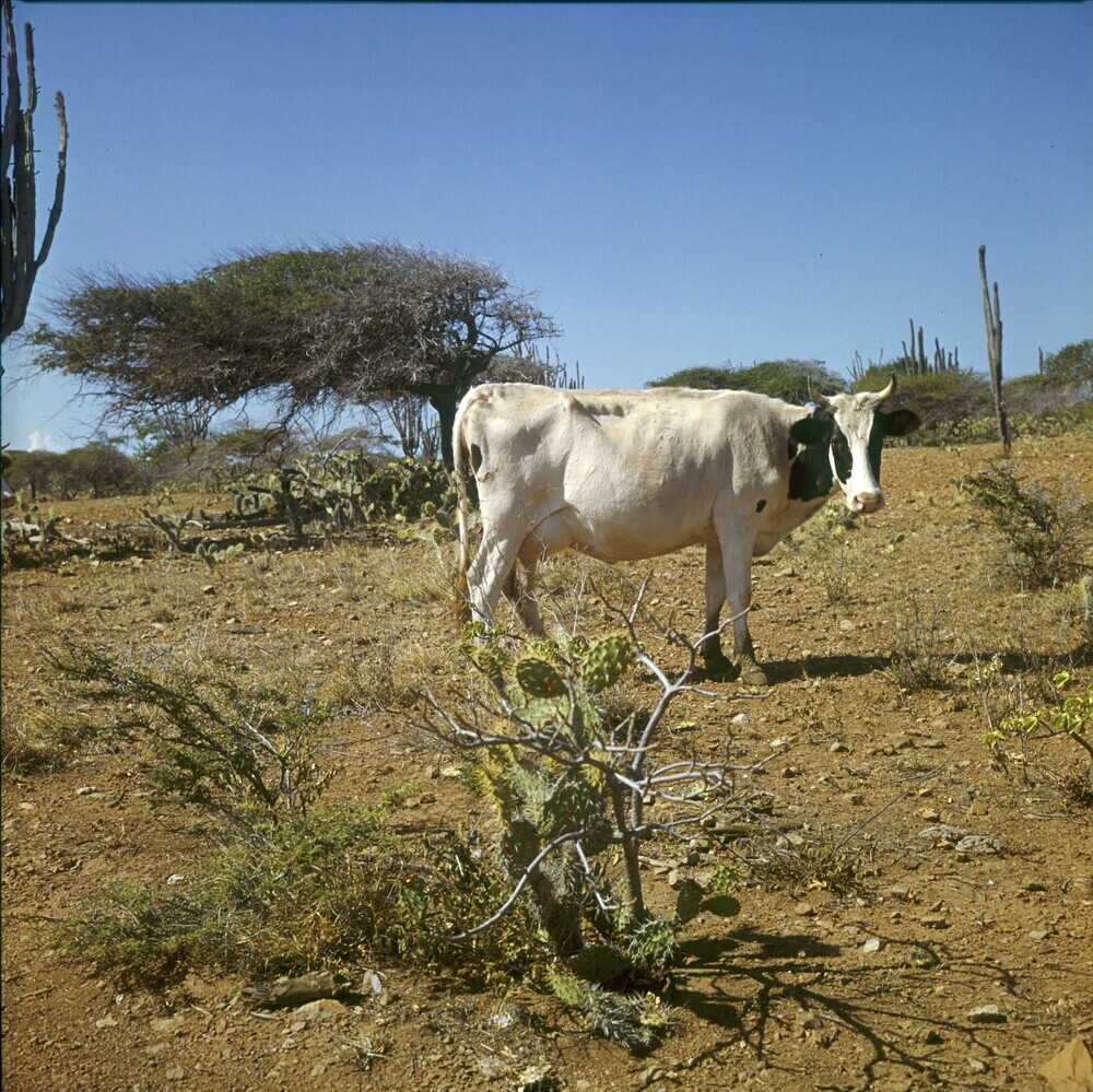 Koe op Plantage Bolivia, met cactussen en op de achtergrond een dividiviboom