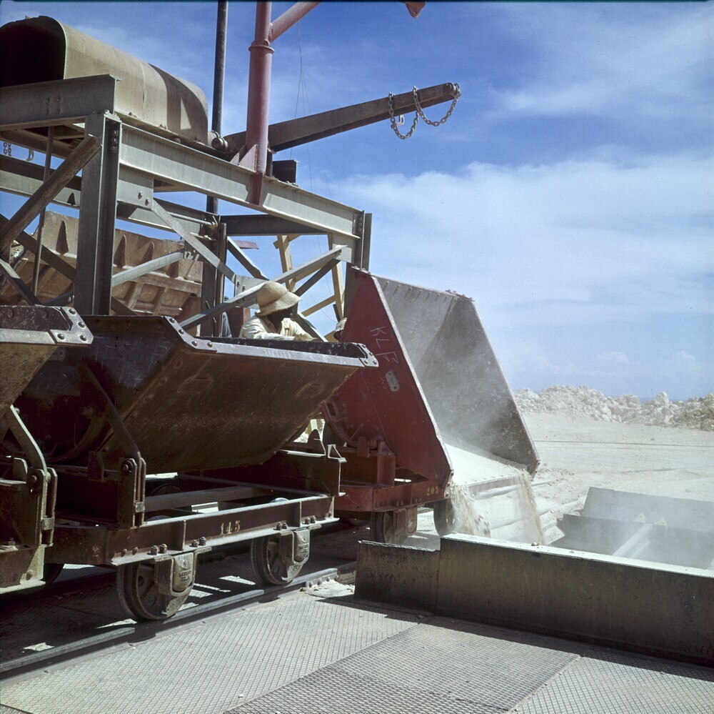 Mijncomplex van de Mijnmaatschappij Curaçao, goederentrein stort fosfaat in de crusher