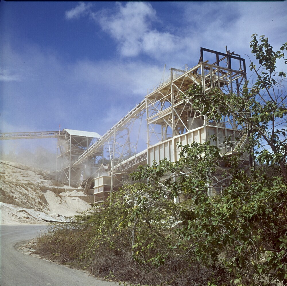 Mijncomplex voor het opboren van fosfaat, op de voorgrond een crusher om het fosfaat te vermalen
