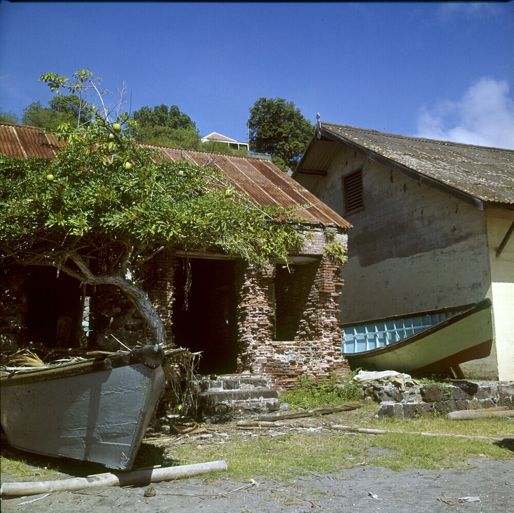 Ruïnes van de oude pakhuizen op het strand benlen bij Fort Oranje
