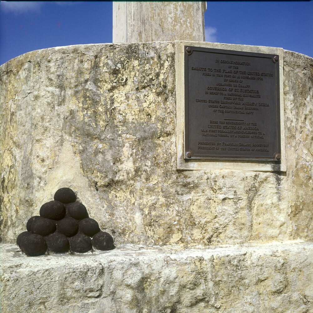 Gedenkplaat in Fort Oranje dat het eerste saluut van een buitenlandse mogendheid aan de Grand Union vlag van de Verenigde Staten herdenkt (1776)