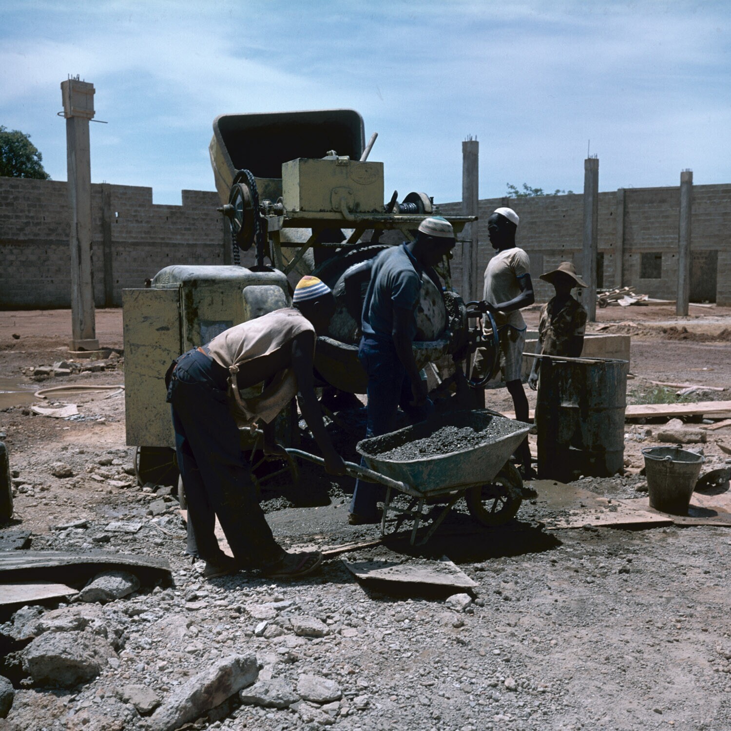 Ouagadougou. Arbeiders bezig met het maken van beton bij een betonmolen