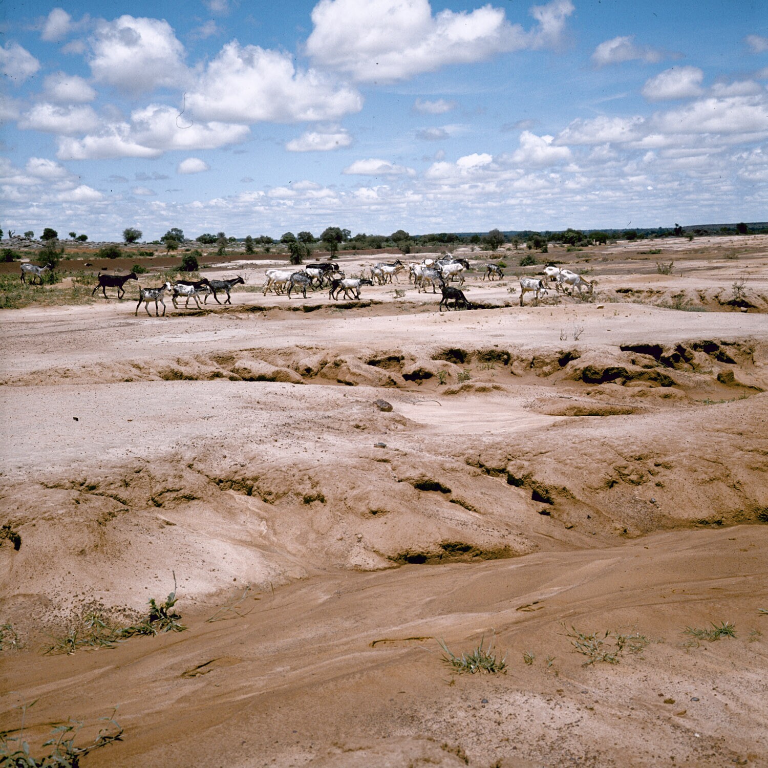 'Kaya. Een kudde geiten in een geërodeerd landschap; op de voorgrond is duidelijk uitspoeling door de regen te zien '