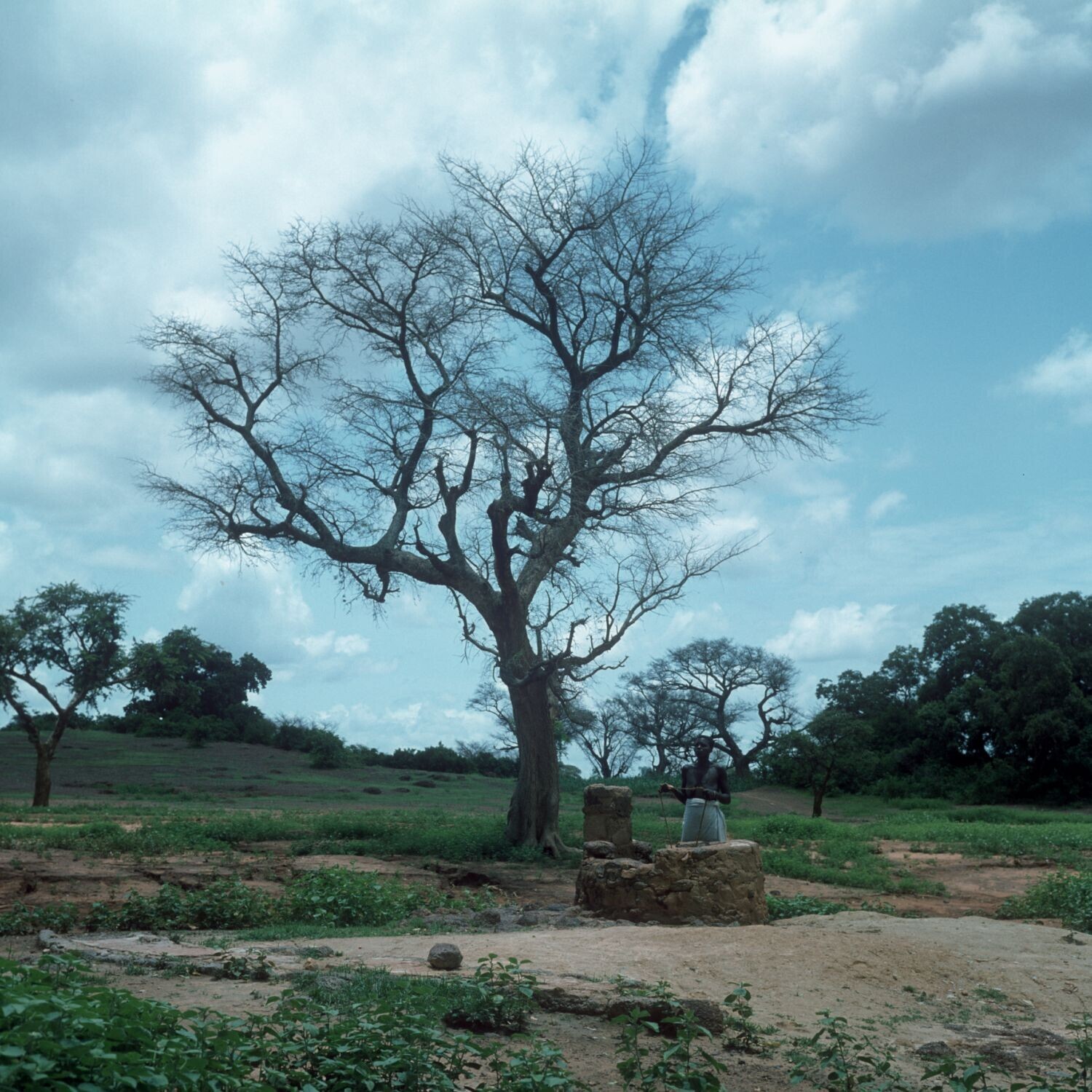 'Een waterput op het platteland; de putrand is gemaakt van steen en klei'