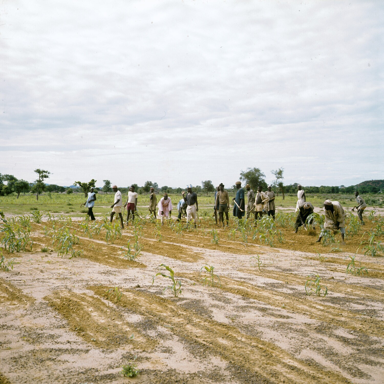 Schoffelwerkzaamheden op een communaal stuk milletaanplant met op de voorgrond door de regen weggespoelde aanplant.