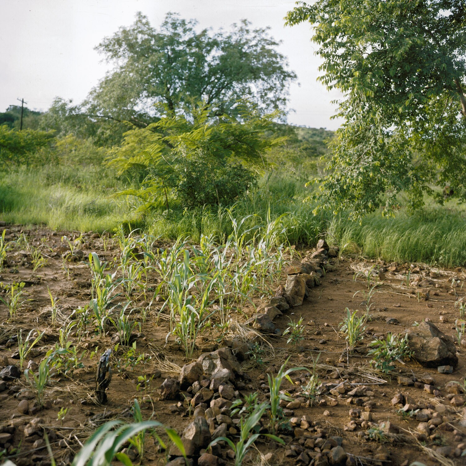 'Met het op richels leggen van stenen probeert men het afspoelen van de vruchtbare grond tegen te gaan; hier een kleine millet aanplant op een lichte helling.'