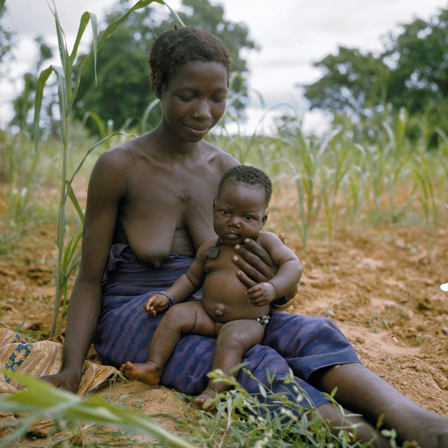 Mossivrouw met kind rustend van haar wiedwerkzaamheden in de millet aanplant.