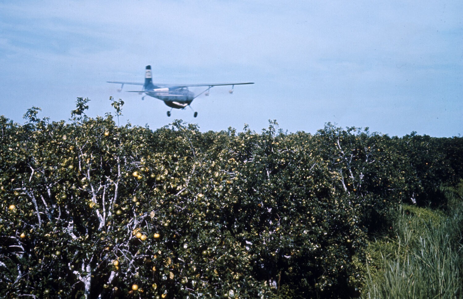 Een vliegtuig besproeit citrusplantage met insecti­cide
