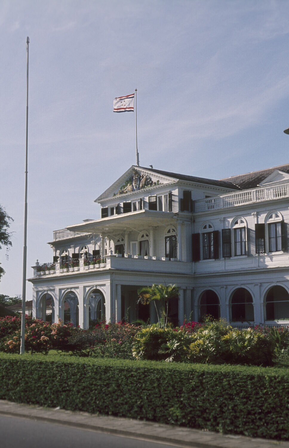 Het gouverneurshuis/presidentswoning met de oude Surinaamse vlag en het beeld van koningin Wilhelmi­na, thans verwijderd