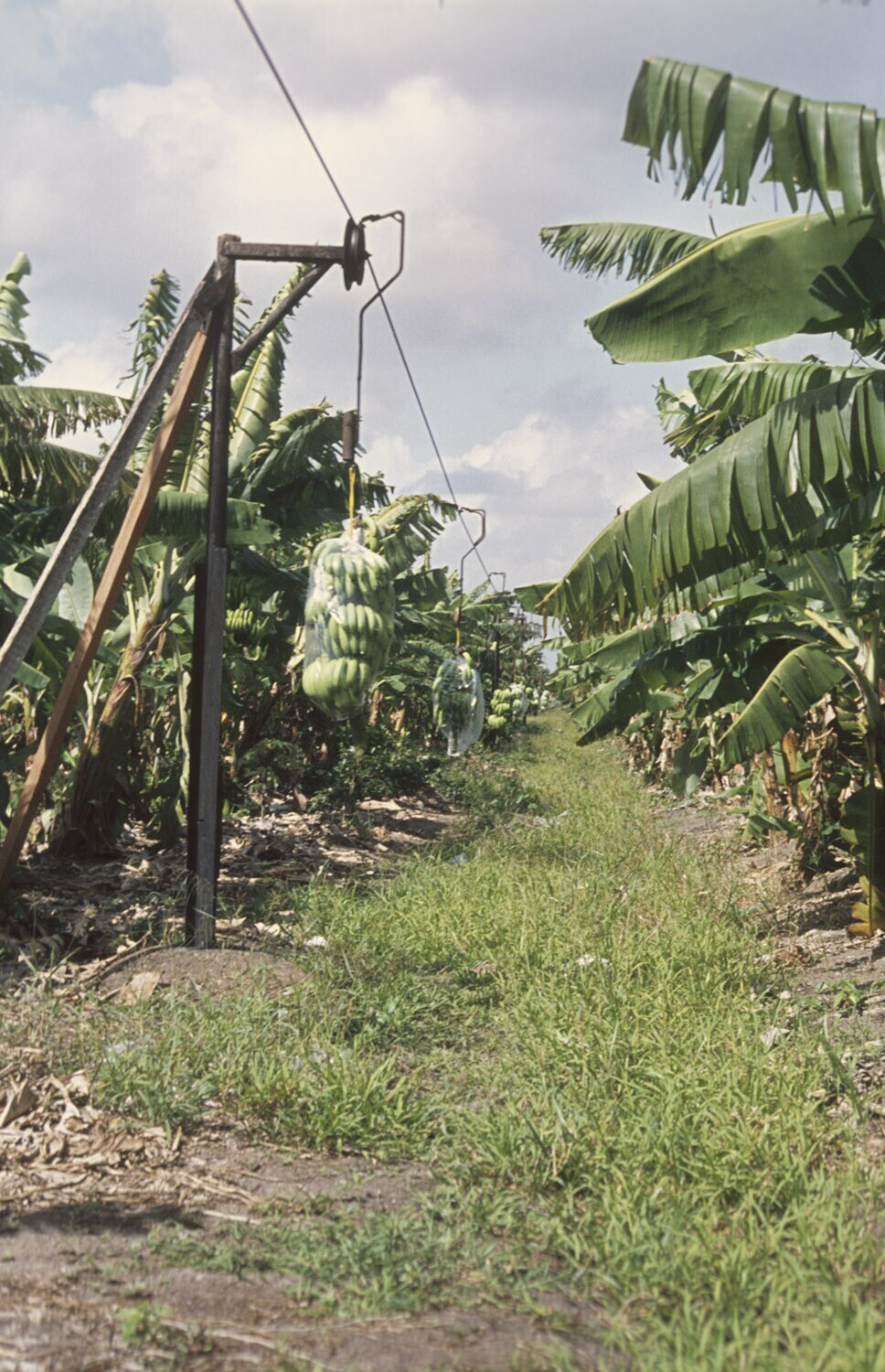 Bakoven aanplant (bananen) in de Santa Boma polder, hier de kabelbaan
