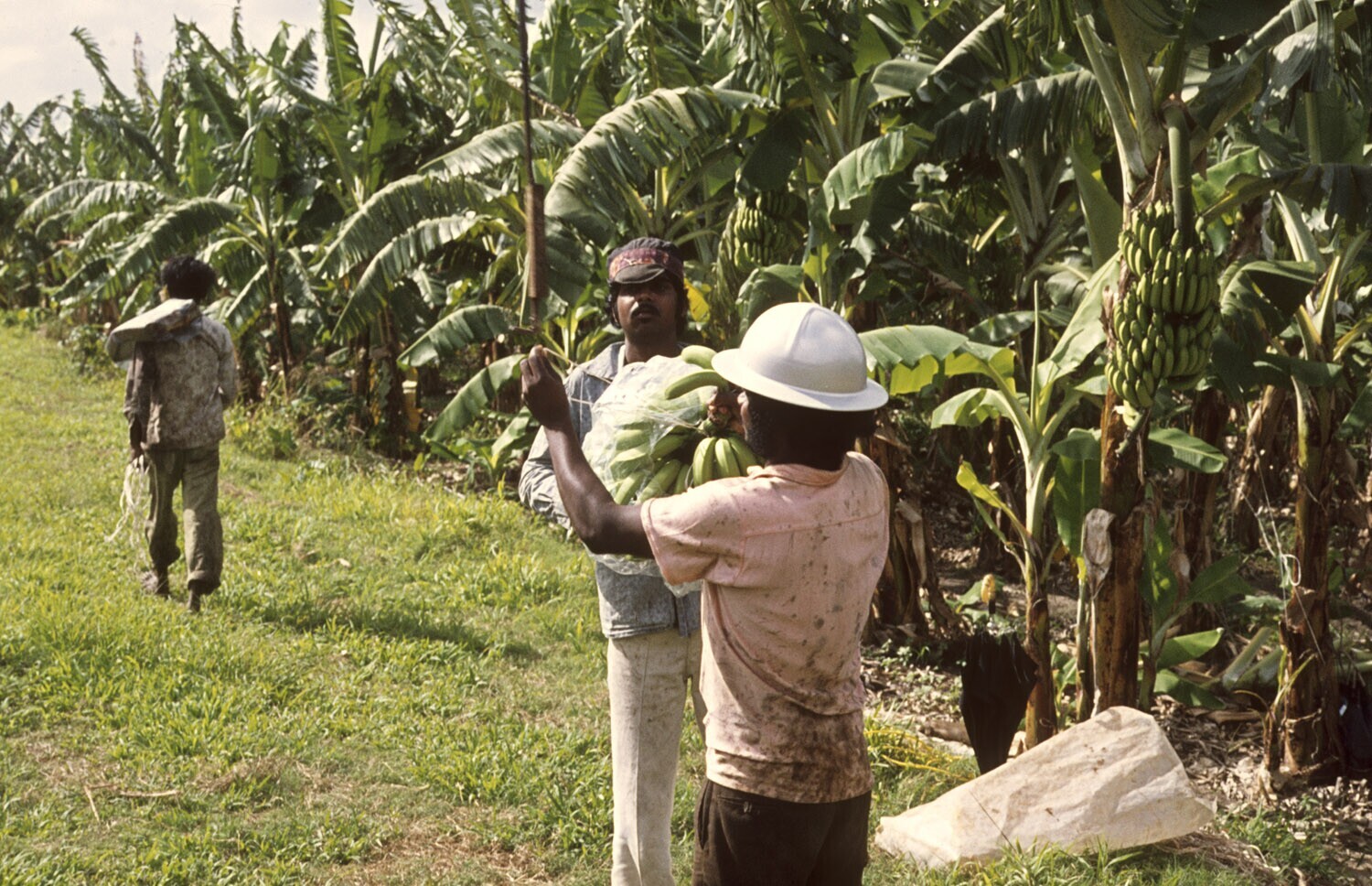 Santa Boma polder. Het aanhaken van de geoogste trossen door twee personen, een team van zes sjou­wers die de trossen uit de tuin naar de kabel sjou­wen en één kapper