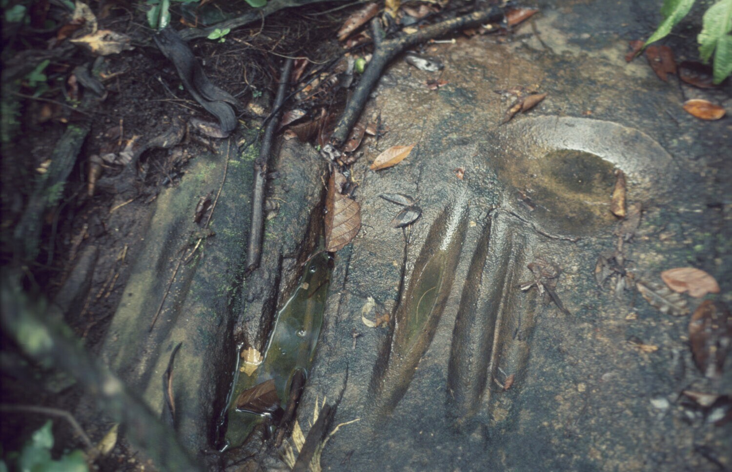Slijpplaats van stenen bijlen van de vroegere inheemse bevolking bij een kreek in het woud, Voltzberg reservaat