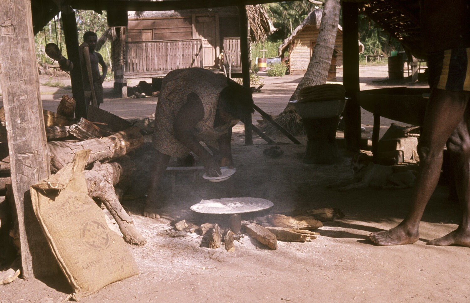 Vrouw bezig met de bereiding van cassavebrood in het dorp Witagron