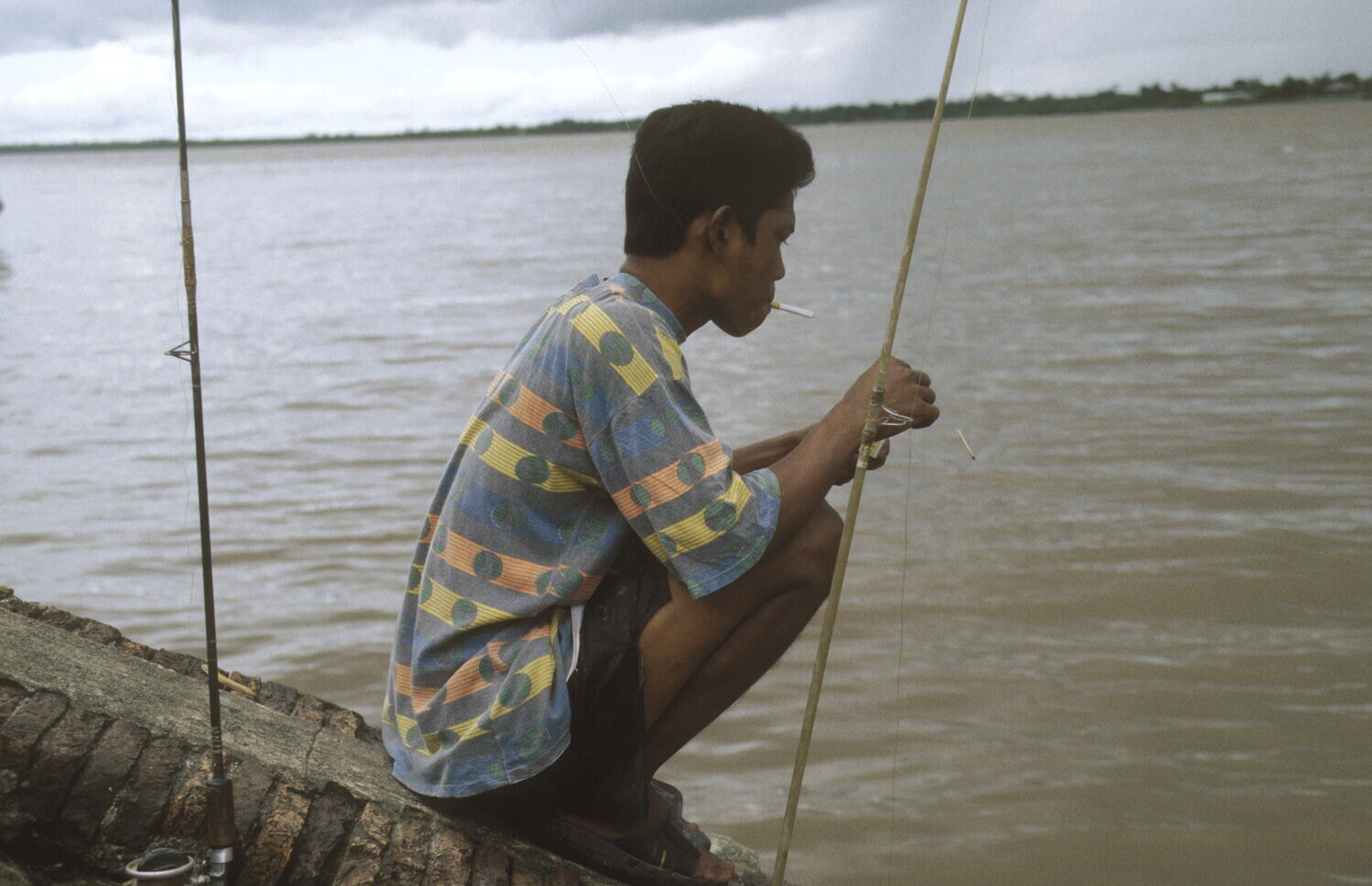 Paramaribo, Suriname rivier bij Waterkant, vissende jongen