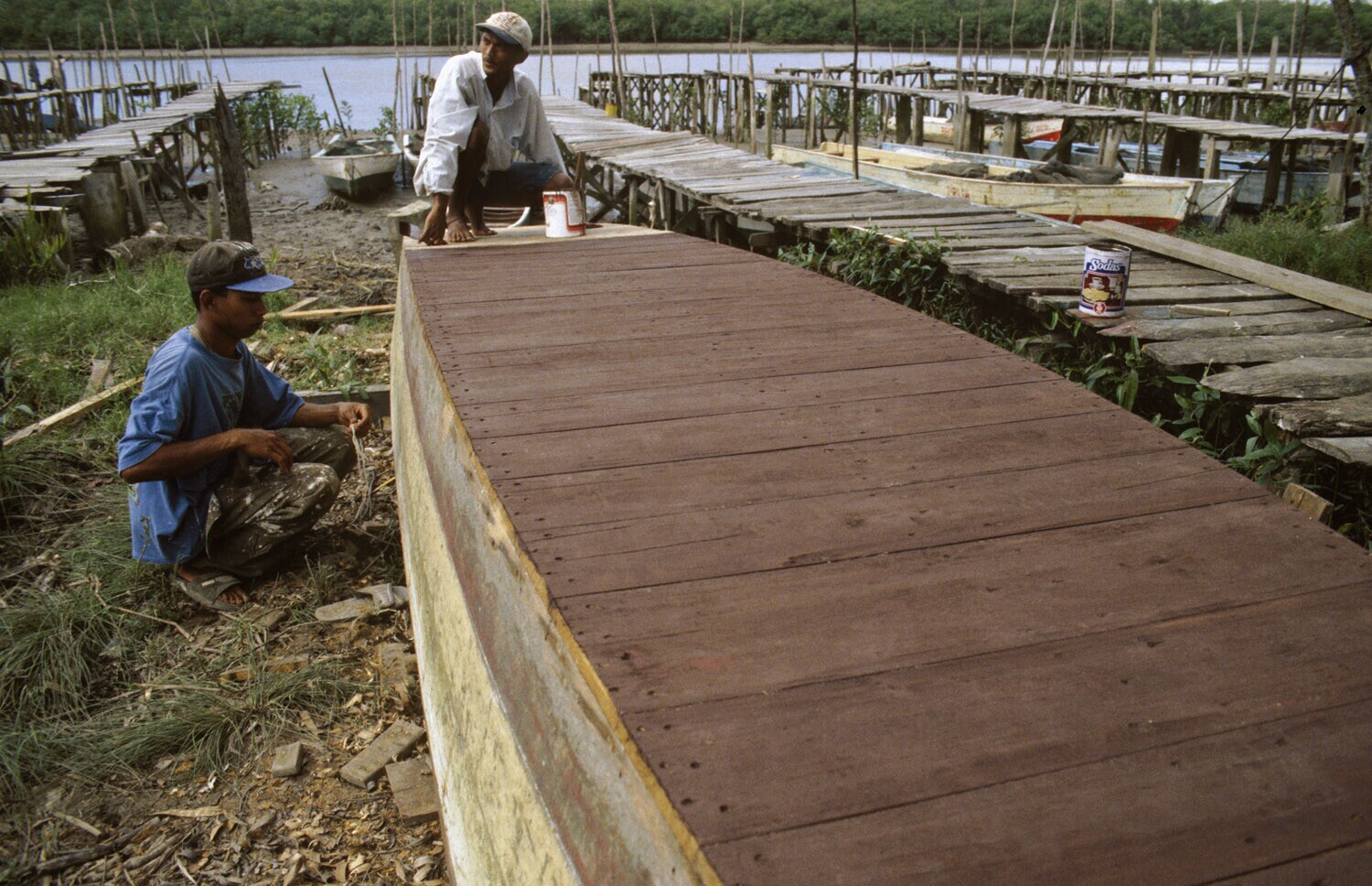 Nieuw Nickerie; bootwerkers; de een dicht de naden; de andere lakt