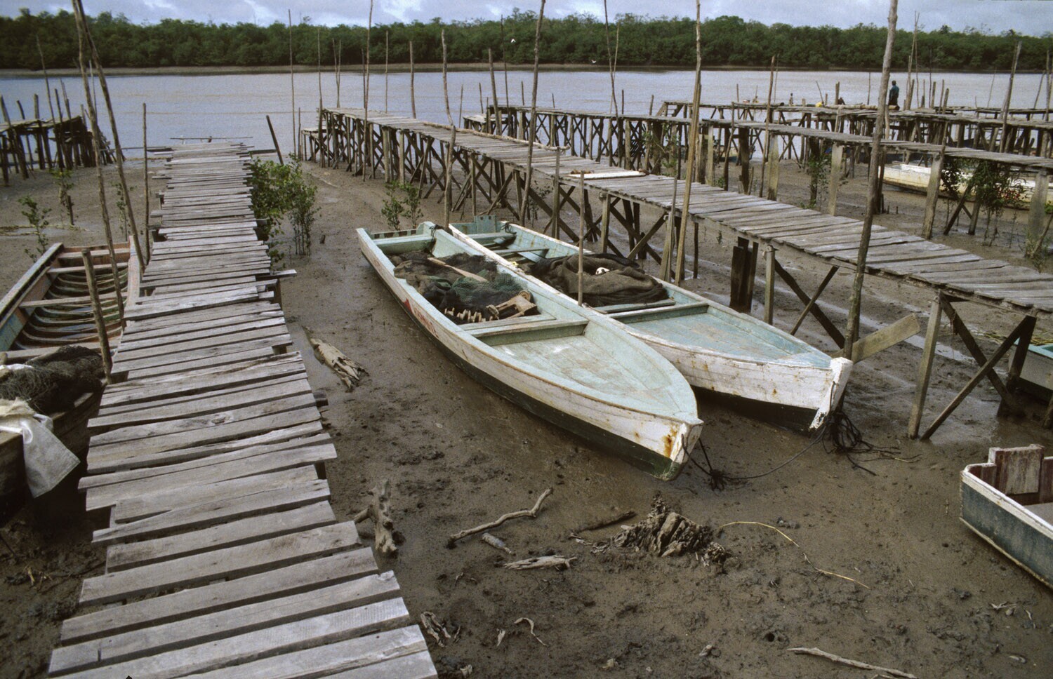Nieuw Nickerie; vissersboten (drooggevallen) in de haven; stijger