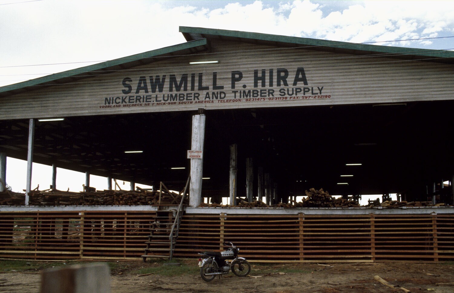 Nieuw Nickerie; houtzagerij Sawmill P. Hiraidem; toegang tot de zagerij, met naambord
