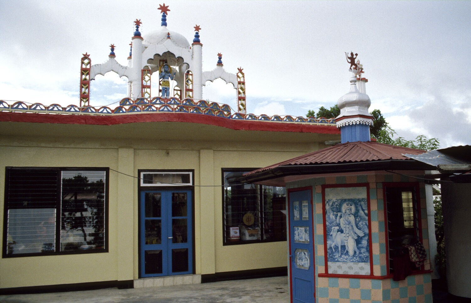 Nieuw Nickerie; hindoestaanse tempel met uitbundige dagversiering