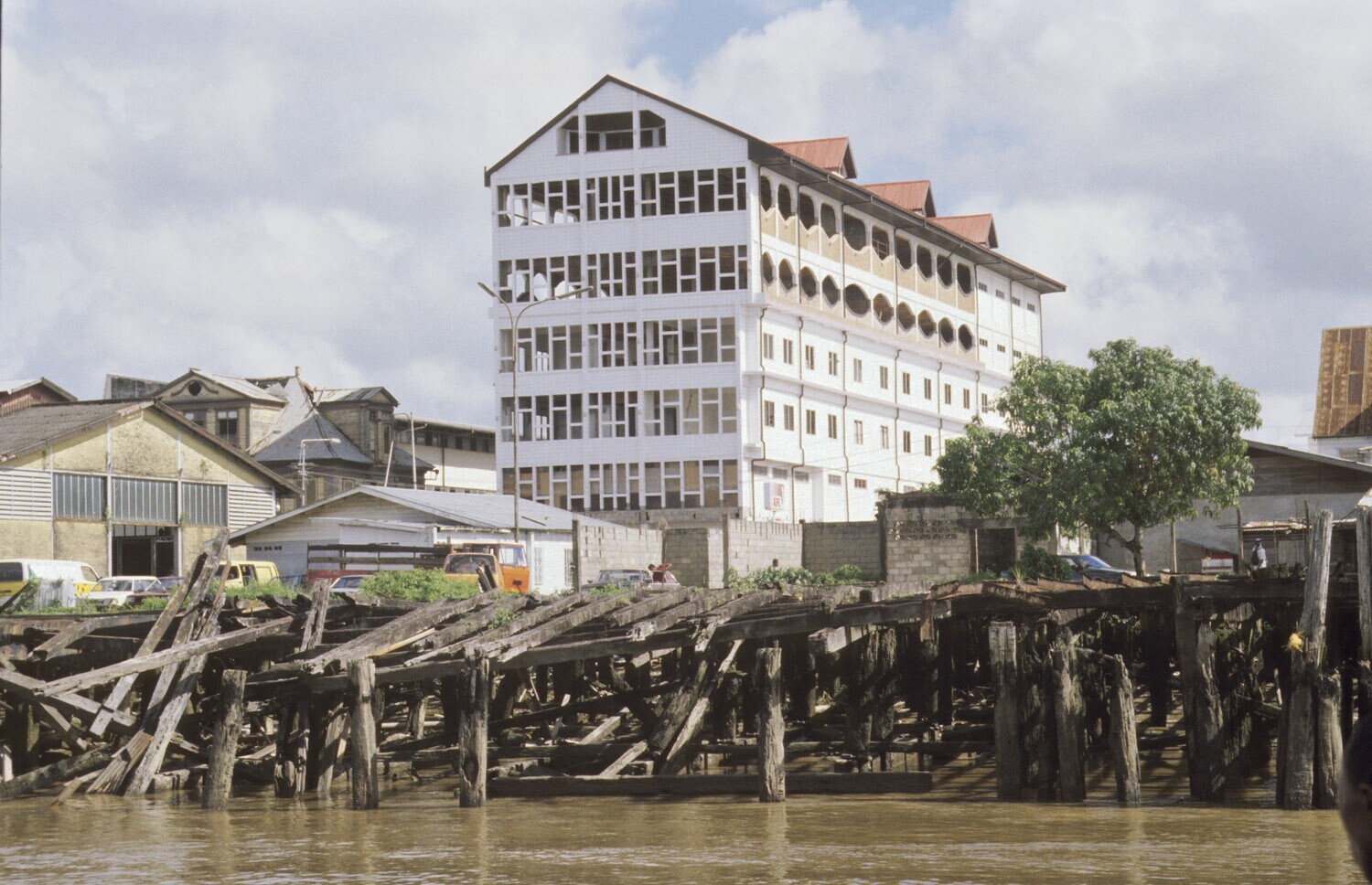Paramaribo, vanaf de Surinamerivier, zicht op in aanbouw zijnd gebouw op voorgrond restanten van KNSM stijger